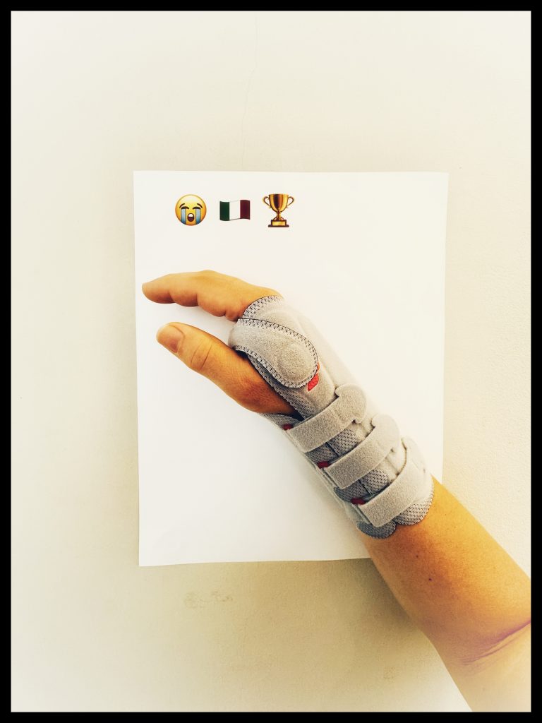 »Schlimmer geht immer!« sagt Tom gerne. Und so kam’s. Aus dem Daumenballengelenksdrama wurde eine Sehnenentzündungsbehandlung mit Power-Kortison durch Sportarzt Doktor Schulz (und Globuli à la Schwester Nelly, DMSO à la Anja und Chinesisches Wunderspray à la Olly), die aber nicht anschlug. Differentialdiagnostisch daher momentan am wahrscheinlichsten: Akutes Karpaltunnelsyndrom! An Schläger-halten ist noch immer nicht zu denken (weder mit noch ohne die unten abgebildete Schiene). Schreiben geht auch nicht, Jeans zuknöpfen u.v.a. plötzlich MAMMUTAUFGABE. Leute, haltet euren rechten Daumen in Ehren! (Ist inzwischen Oak’s zweitliebstes Körperteil). Mal sehen, ob es mit IBU’s am Montag bei Oak überhaupt zu einem Spiel kommen kann, er wird wegen der Verletzung definitiv schonmal der untrainierteste Spieler dort sein – und das obwohl man bereits seit gestern überall in Rom in den prädestinierten Fitnessstudios TT üben kann. All eyes on Tom! Aber heute abend gewinnt Deutschland erstmal im Euro-Fußball, dann sehen wir weiter, wie es der deutschen TT-Auswahl Oak & Tom weiter ergeht ….