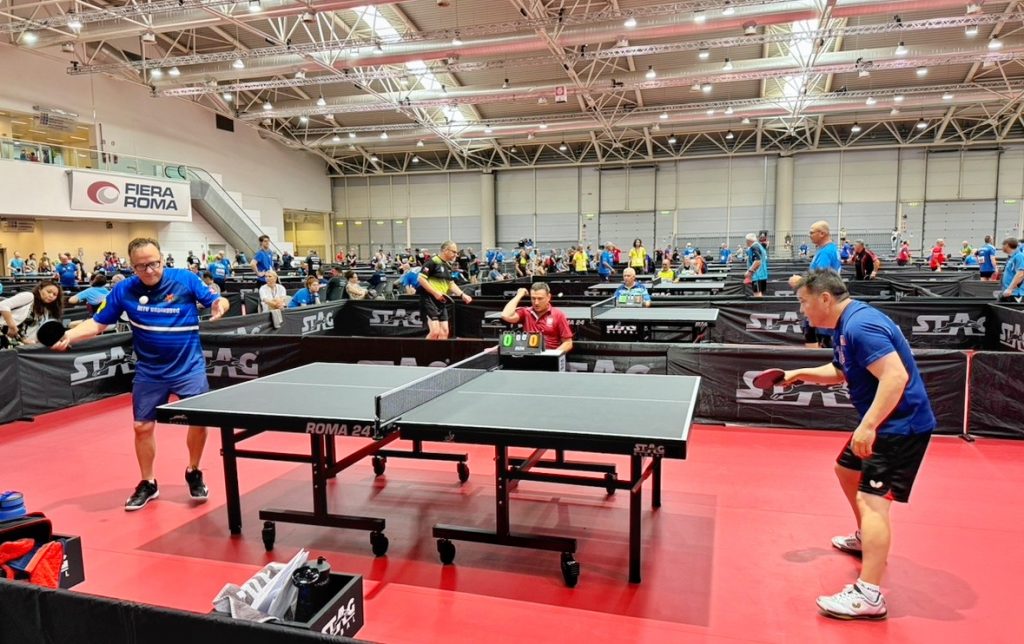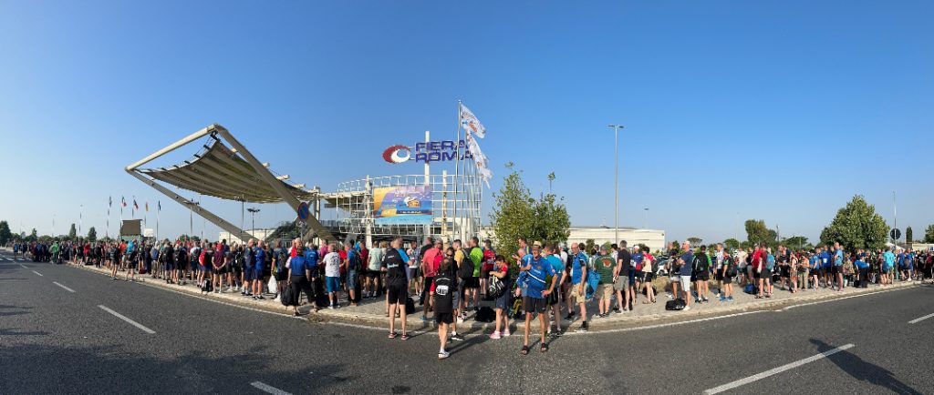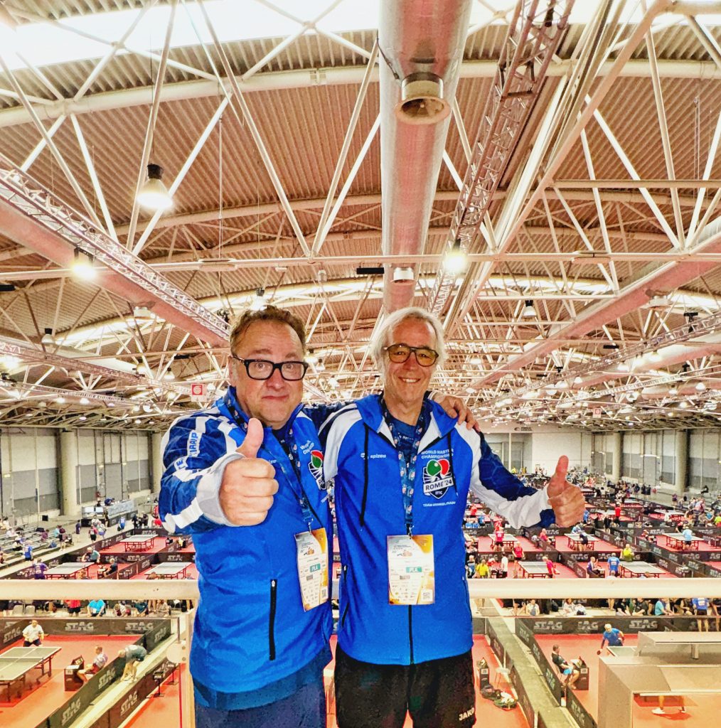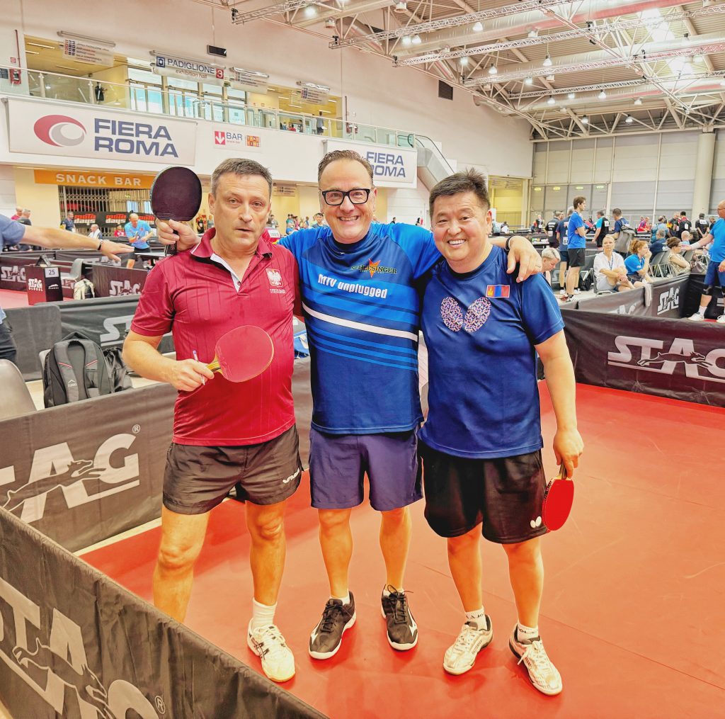 Es ist 5:45, als Tom die Vorhänge im WM-Quartier aufzieht. TODAY ISCH THE DAY! Toms Gruppenspiele sind um 17:50, die von Oak schon um 9 Uhr morgens. Im Frühstücksraum des Holiday Inn herrscht reges Treiben: Japan, Indien, Belgien und vor allem viel Deutschland bereitet sich am Buffet intensiv aufs Turnier vor (ca. die Hälfte der Athleten ist „ziemlich gut beieinander“). Oak wirft nach ausgetüfteltem Plan vor und nach dem Frühstück Ibuprofen ein. Als Tom und Oak in der Morgenhitze (Wochenrekord) aus dem Taxi vor der Nuova Fiera steigen, herrscht schon Halli Galli, 8:15 und die Tore sind noch zu. (Italia!) Aber kurz darauf strömen die Massen in die Hallen. An Tisch 33 trifft Oak auf Polen, Mongolei und Slowenien. Das Adrenalin pumpt. Player Artur Rachanski aus Polen schüttelt Oak die Hand und überreicht ein Goodiebag. Erster Schock: Mein Gott, der ist ja supernett! Im Laufe der nächsten 60 Minuten spielen die Endorphine verrückt. Auch Erdenessukh Nyamsuren aus der Mongolei ist super nice. Alle sind mit Sekundanten angereist, Händeschütteln für die Fotografen, supergute entspannte WM Stimmung, Freunde von der ersten Sekunde an. Mehr Lachen und Grinsen als Schreien und Schwitzen. Der kleine Court in der Riesenhalle mit hunderten anderen Courts wird zur Kameradschaft-Insel der Gruppe 33. Erste Erkenntnis: WMs machen süchtig.