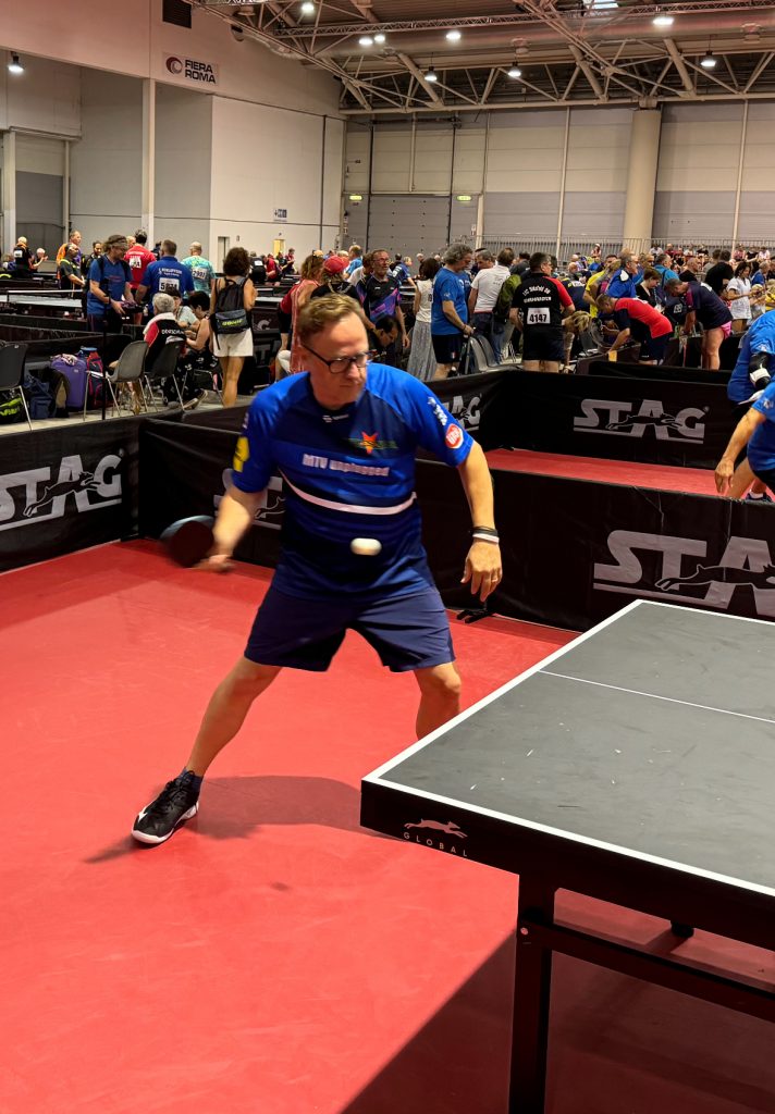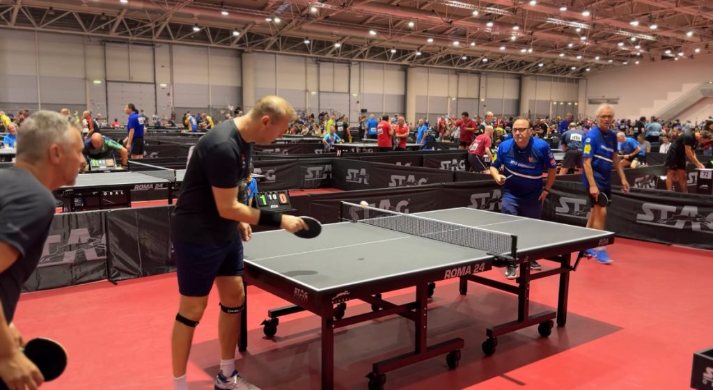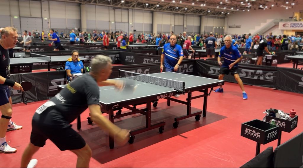 Für Tom & Oak ist das erstmal ein kleiner Schock. Selbst Oaks tagesüblicher Größenwahn schrumpelt auf Tischtennisballgröße. Was soll man diesen beiden skandinavischen Titanen entgegensetzen?! Man könnte maximal in Würde untergehen, aber eigentlich nicht mal das scheint möglich, je länger man den beiden beim Trainieren zusieht. Auch das italienisch-belgische Doppelteam Guidi/Dussart schaut ungläubig drein. Diese beiden wurden sich zugelost und kannten einander vorher nicht. Oak dolmetscht den beiden ein bißchen und die römische WM-Lockerheit zieht wieder ein wenig in die Gemüter ein.